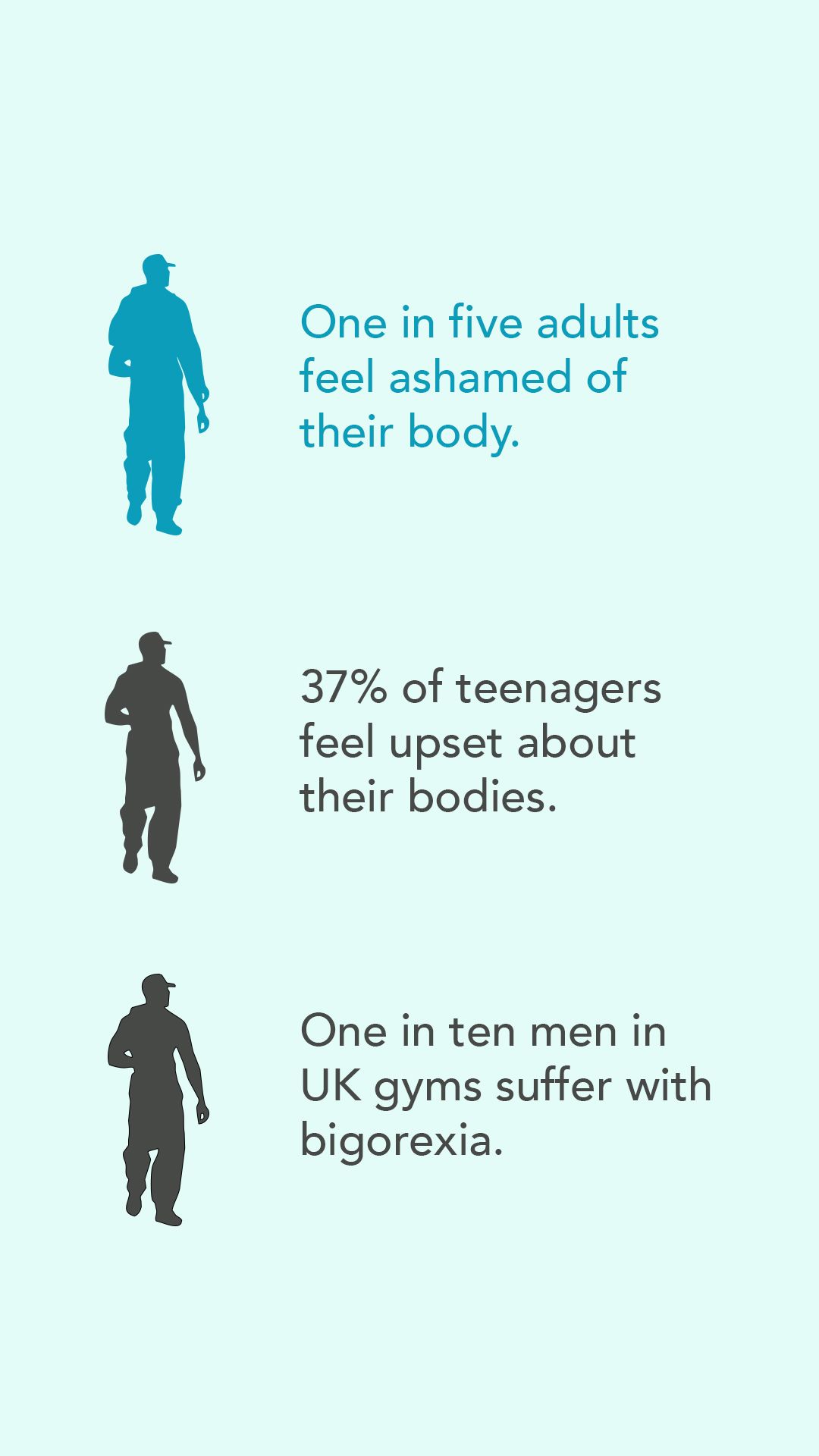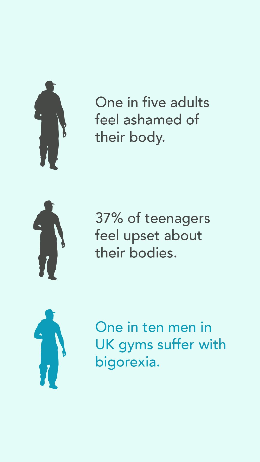 Some have referred to body dysmorphia among fitness enthusiasts as ‘bigorexia’. Many gym-goers are constantly striving to be bigger, and never happy with how they look. Many even see themselves as too ‘skinny’ or too 'fat'.